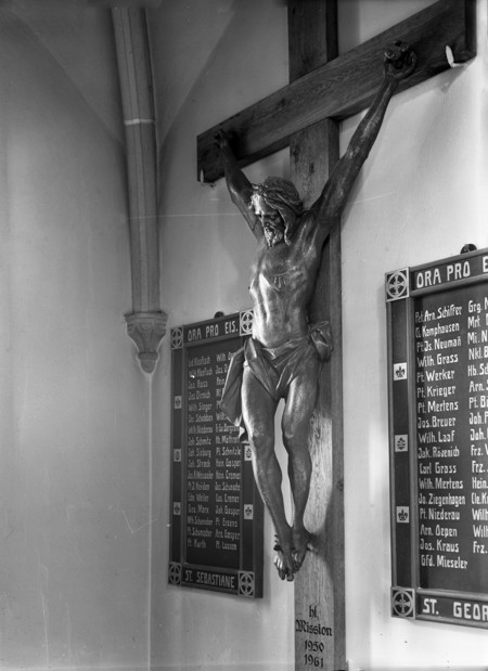 2 Namenstafeln der Gefallenen im 1. WK neben einem Kruxifix um