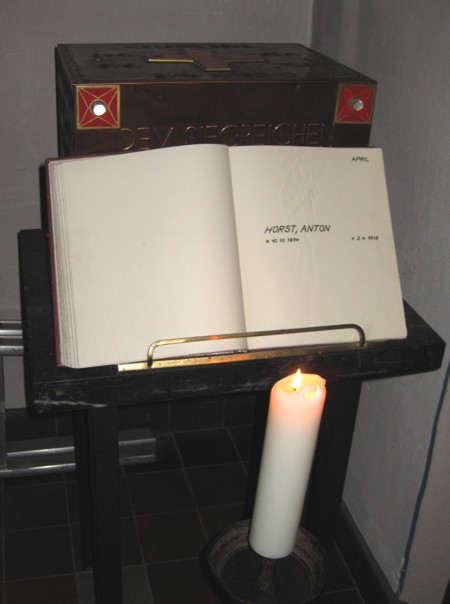 Ehrenbuch ausliegt, trägt die Inschrift: „O CRUX AVE | 1914 1918 | 1939 1945 | SPES NOSTRA| DEM SIEGREICHEN STREITER WILL ICH DAS GEHEIMNISVOLLE BROT UND EINEN NEUEN +NAMEN GEBEN+.“