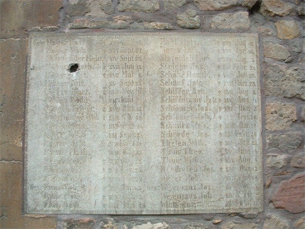 Neben dem Kircheneingang der St. Michaels Kirche wurden zwei Tafeln mit den Namen der Gefallenen in die Mauer eingesetzt. Auf dem Torbogen befindet sich folgende Inschrift: „Gedenken wir in christl. Liebe derer, welche als wahre Makkabaeer bereit waren fürs Vaterland zu sterben. Tiefer als in Stein sind in unsern Herzen eingegraben ihre Namen:“ (siehe 2.Makkabäer 8,21)