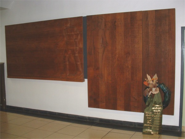 „GETREU DEM EIDE OPFERTEN SIE IHR LEBEN | IHR TOD WAR RÜHMLICH UND EHRENVOLL | HEILIG SEI UNS IHR GEDENKEN | 1939 - 1945 - DEN GEFALLENEN DER LANDWIRTSCHAFTSSCHULE DÜREN | UNSER OPFER IST EURE VERPFLICHTUNG FRIEDEN“