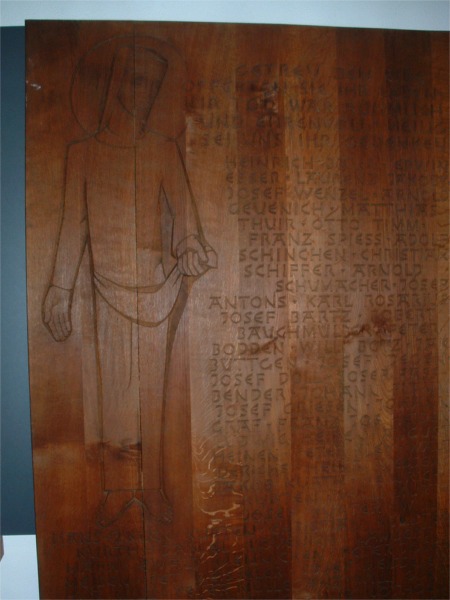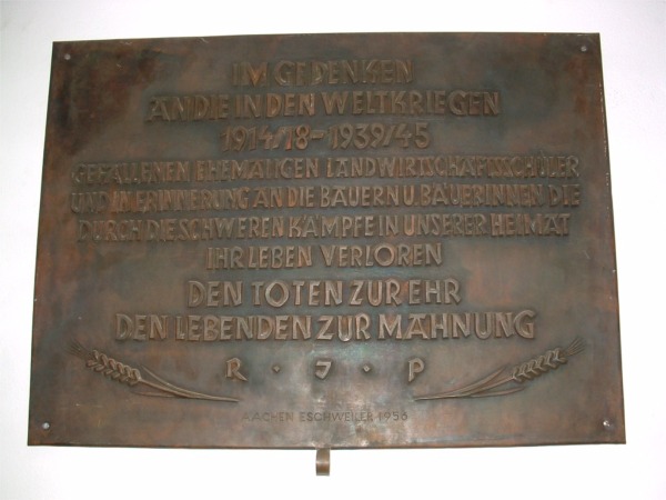 „IM GEDENKEN AN DIE IN DEN WELTKRIEGEN 1914/18 - 1939/45 GEFALLENEN EHEMALIGEN LANDWIRTSCHAFTSSCHÜLER UND IN ERINNERUNG AN DIE BAUERN U. BÄUERINNEN DIE DURCH DIE SCHWEREN KÄMPFE IN UNSERER HEIMAT IHR LEBEN VERLOREN | DEN TOTEN ZUR EHR | DEN LEBENDEN ZUR MAHNUNG | R.I.P | AACHEN ESCHWEILER 1956“