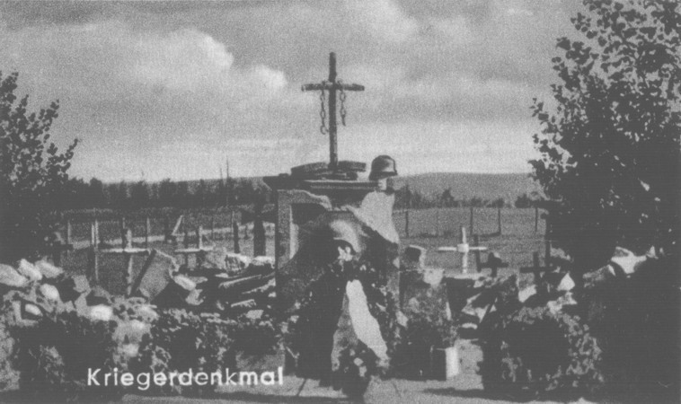 Kriegerdenkmal mit Soldatengräbern. Das Denkmal weist deutliche