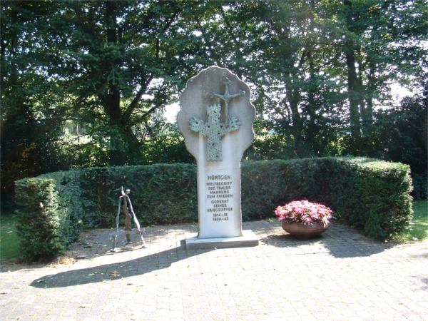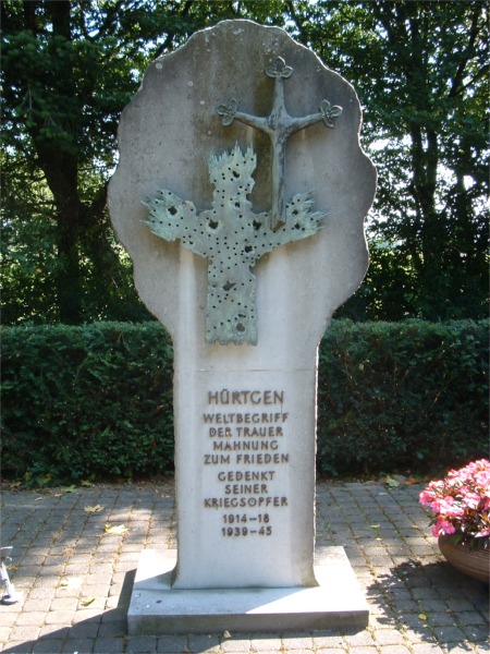 An der Friedhofskapelle in Hürtgen steht ein Mahnmal mit der Aufschrift: „HÜRTGEN WELTBEGRIFF DER TRAUER MAHNUNG ZUM FRIEDEN | GEDENKET SEINER KRIEGSOPFER 1914-18 | 1939-45“.