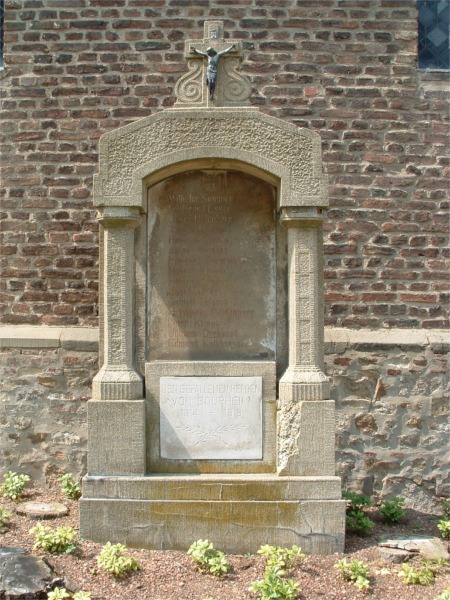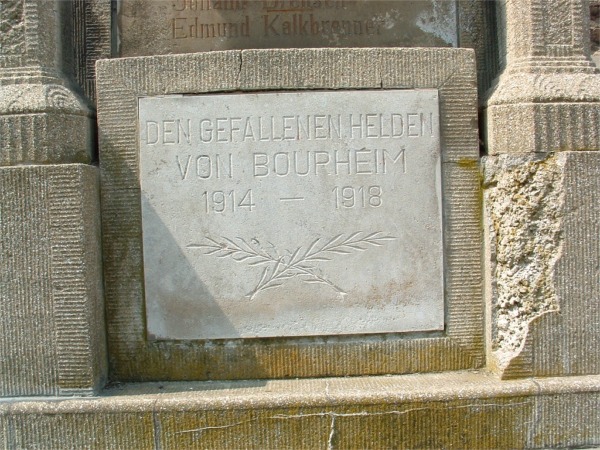 Vor der Bourheimer Kirche steht ein Ehrenmal für die Gefallenen des Ersten Weltkrieges mit der Inschrift: „DEN GEFALLENEN HELDEN VON BOURHEIM 1914 - 1918“