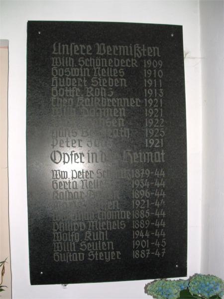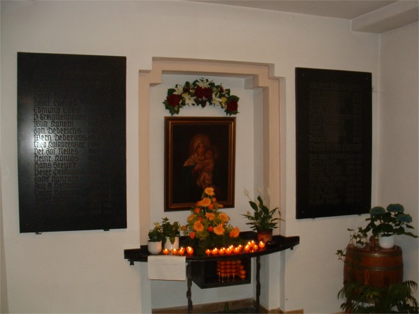Im Eingangsbereich der Bourheimer Kirche hängen links und rechts von einem Marienbild zwei Ehrentafeln mit den Namen der Vermissten, Gefallenen und Opfer in der Heimat im Zweiten Weltkrieg.