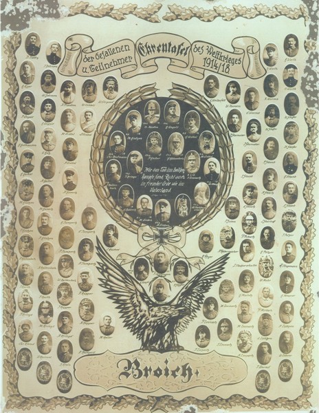 „Ehrentafel der Gefallenen u. Teilnehmer des Weltkrieges 1914/18 | Broich | Wer den Tod im heil´gen Kampfe fand, Ruht auch in fremder Erde wie im Vaterland.“ Die Ehrentafel von 1920 zeigt alle Gefallenen und Kriegsteilnehmer des Ersten Weltkrieges aus Broich. Von Herrn Matthias Schiffer, Düren existiert noch eine umfangreiche Totenzettelsammlung der gefallenen Soldaten im 2. Weltkrieg. Diese wurden auch zwecks einer Ausstellung als Kopie auf Holz zusammengefasst (Bilder rechts).