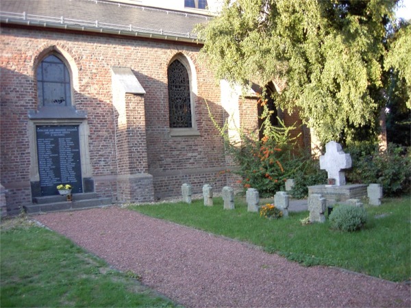 Rechts vom Haupteingang der St. Philippus und Jakobus Kirche in Güsten liegen insgesamt 9 Kriegstote. Auf einem Gedenkkreuz bei den Kriegsgräbern steht „IN GEDENKEN AN UNSERE TOTEN“. Neben den Gräbern, an einem zubetonierten Seiteneingang der Kirche, hängt eine Marmortafel mit den Namen der Gefallenen im Zweiten Weltkrieg. Die Inschrift lautet: „GEFALLENE UND VERMISSTE SOLDATEN DER GEMEINDE GÜSTEN 2. WELTKRIEG“. Diese Namenstafel ist relativ neu und wurde erst um ca. 2001 errichtet.