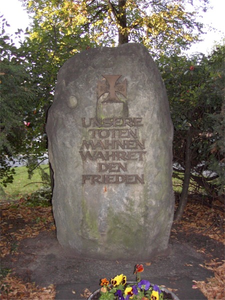 Vor der Kirche, am Johannesplatz, befindet sich ein Mahnmal mit Eisernem Kreuz, darauf die Jahreszahlen der Weltkriege 1914 1918 | 1939 1945 und darunter die Inschrift: „Unsere Toten mahnen | Wahret den Frieden“