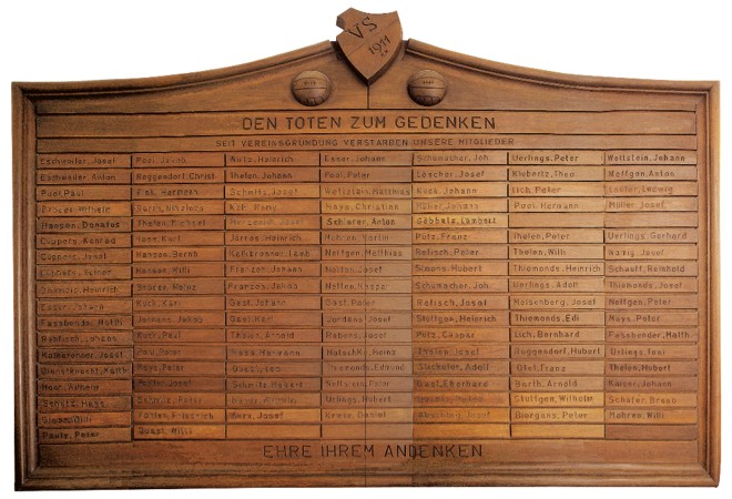 Sportheim eine Tafel mit den Namen der verstorbenen Vereinsmitglieder seit der