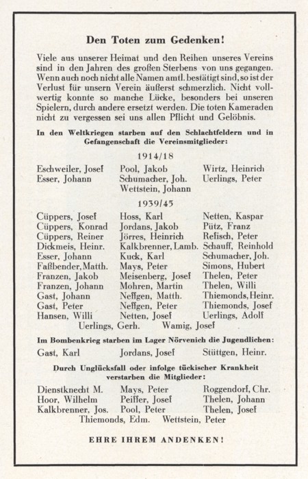 der Kriegstoten beider Weltkriege vom F.C. Victoria 1911 e.V. Schlich /