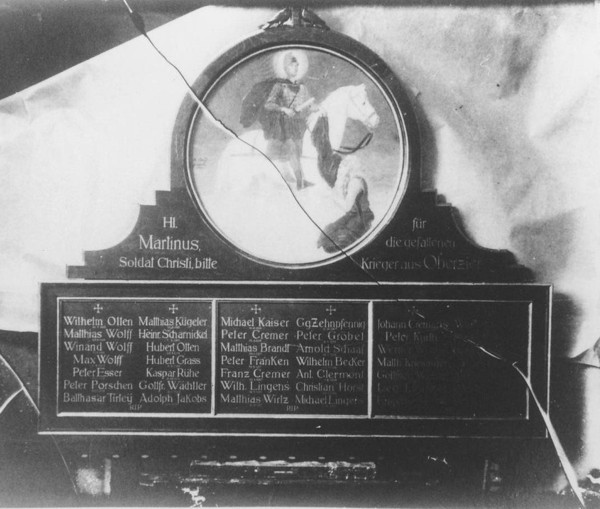und zeigte den hl. Martinus als Krieger auf Pferd und verzeichnete die Namen der Kriegsopfer von Oberzier des Ersten Weltkriegs sowie die zwei Kriegstoten